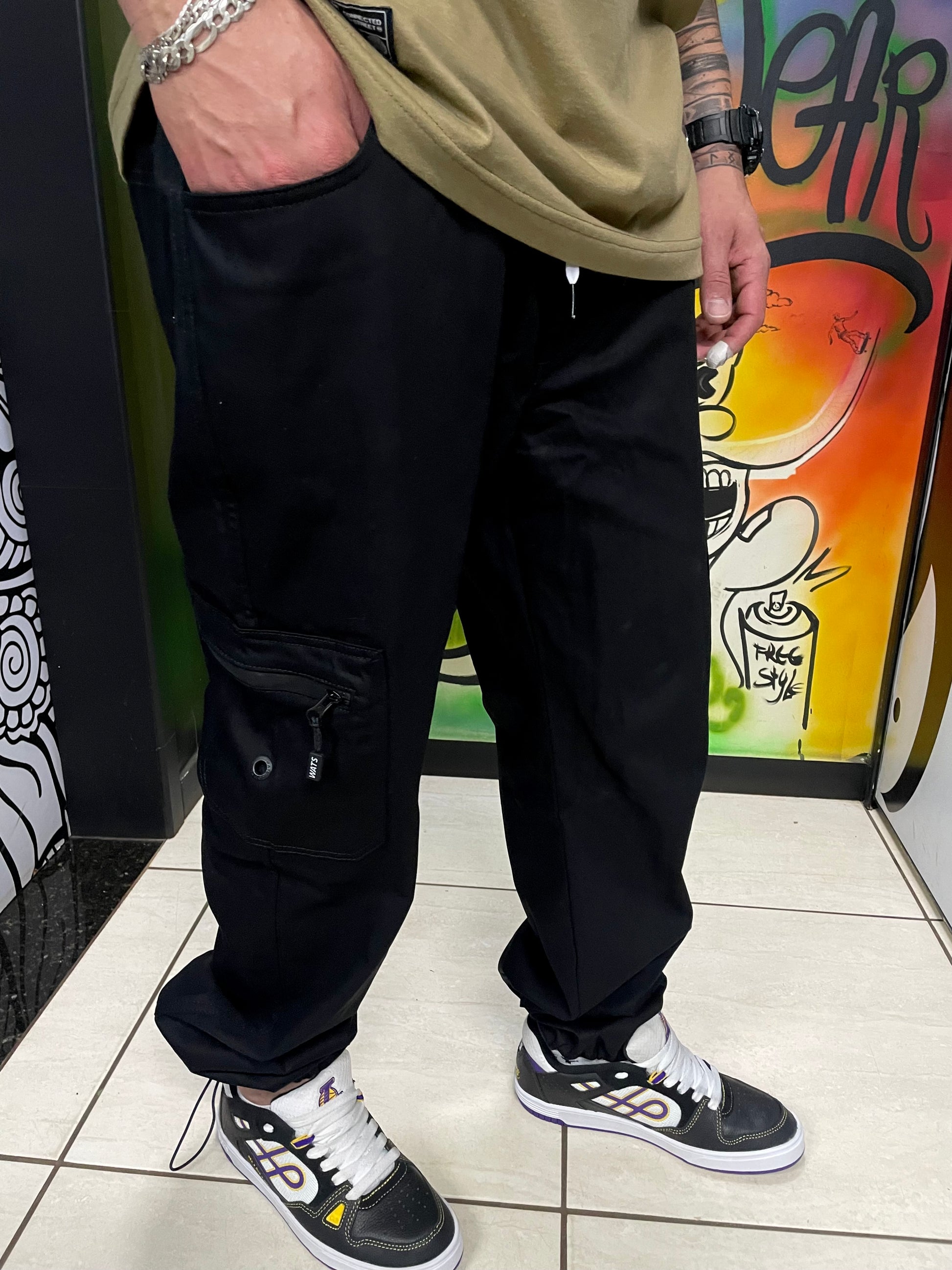 Calça confeccionada com tecido de Sarja Ripstop. Seu modelo é mais largo do que as calças tradicionais.