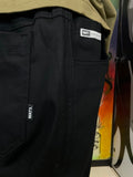 Possui elástico no cós, dois bolsos frontais, dois bolsos laterais e dois bolsos traseiros.
