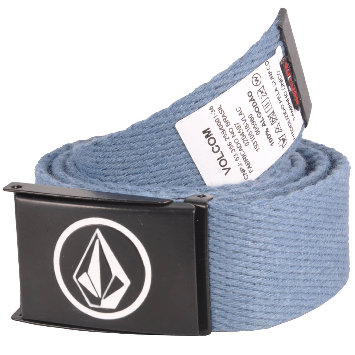 Cinto Volcom com Circle Stone em baixo relevo com cobertura em branco, fivela frontal e ponteira de metal.