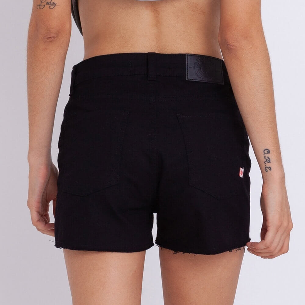 Bermuda shorts linha especial Essential de sarja feminino com botão demetal, projeto essentials, lavanderia amaciada, barra desfiada e etiquetas Element.