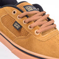 Possui cabedal em suede natural mesclado com nylon esportivo 100% poliéster e sintético refletivo no calcanhar. Palmilha de P.U e solado de borracha natural.